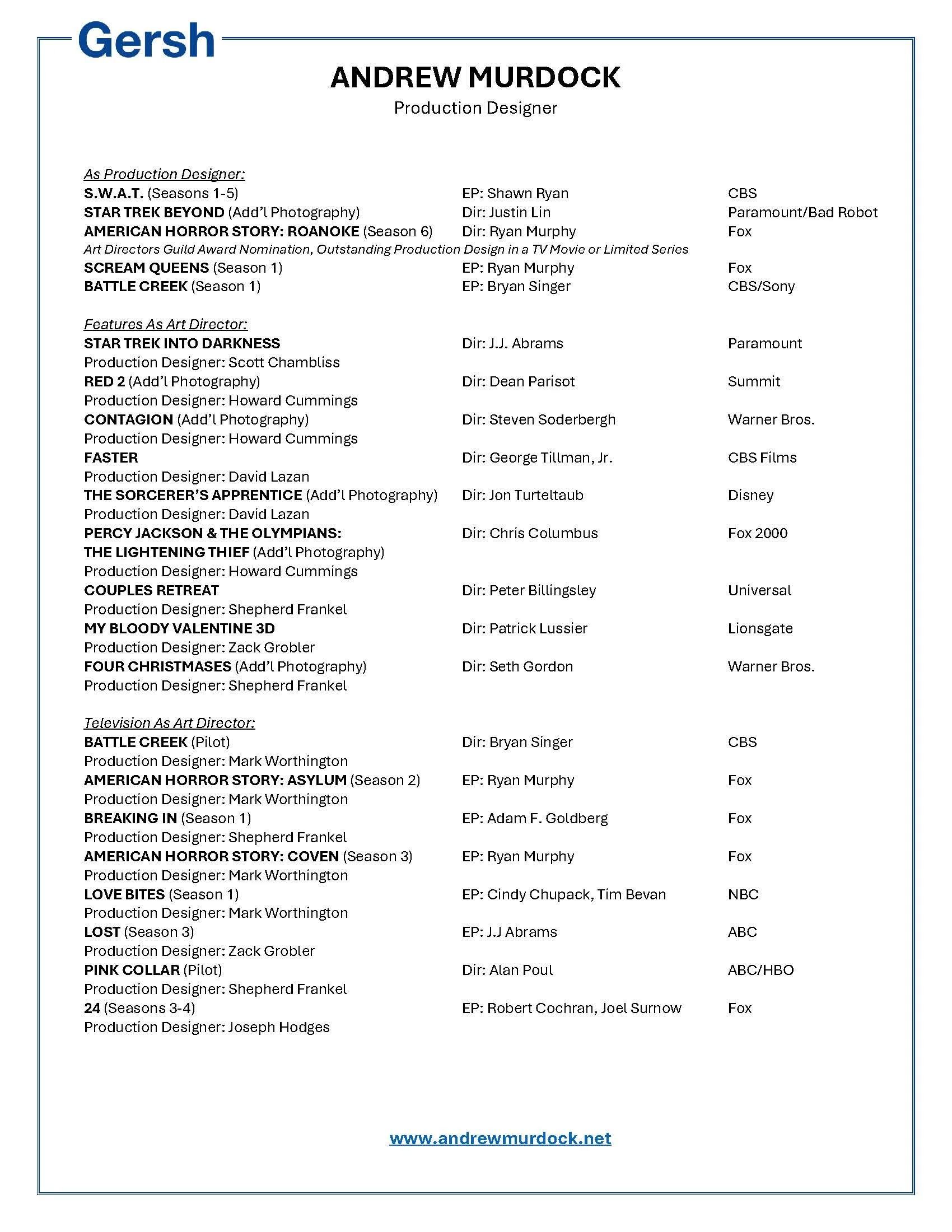 Andrew's initial PRODUCTION DESIGN projects include television commercials directed by Luke Scott at RSA. These projects lead to Assistant ART DIRECTING work on the films MONKEYBONE and LOONEYTUNES - BACK IN ACTION. Soon after, Andrew became established as an Art Director working on major television projects 24 and LOST (Hawaii), and then the iconic anthology series American Horror Story Asylum, Coven and Freak Show. He also Art Directed feature films Faster, My Bloody Valentine (Pittsburgh), Couples Retreat (Bora Bora) and Star Trek Into Darkness, which provided further experience in science fiction world building.